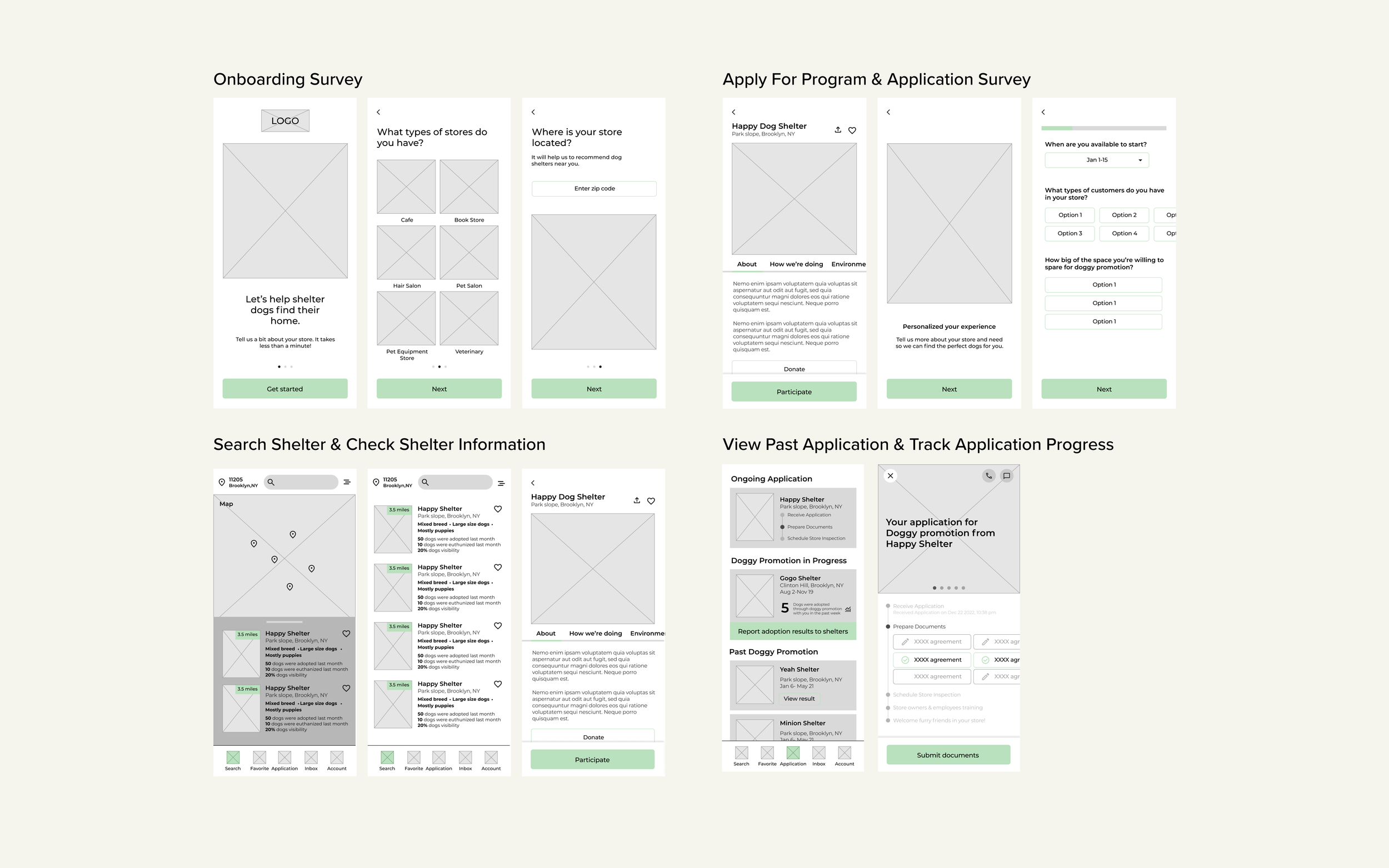 The app will show local store owners a list of shelters in the nearby area, local store owners can browse through this shelter information and choose which dog shelters they want to build a connection with. After the store owners decide to participate, they will be asked to fill out the survey to inspect the store environment and customer type, and their preference for the type of dogs that will be put in the store.
