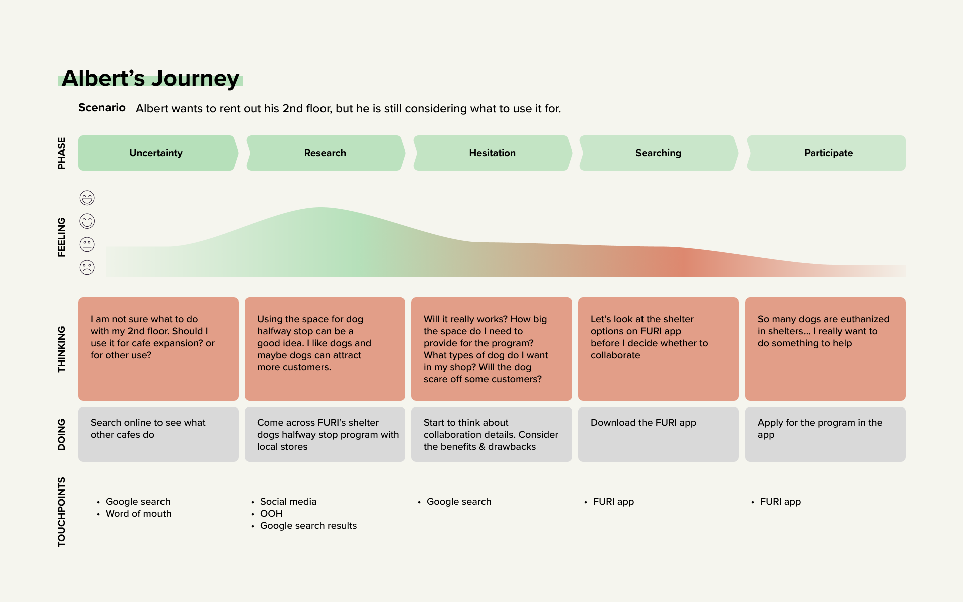 Furi app connects dog shelters with local stores to build dog halfway stop in stores, to enhance shelter dogs' exposure to the public and increase adoptability.